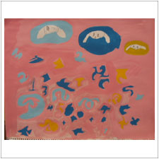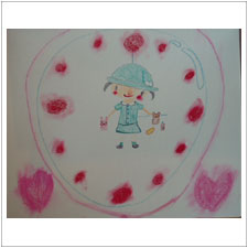 そのこちゃんのは,いろんなモティーフの中にかわいい犬がいます。ピンクが明るくて楽しくて,わくわくする絵です。 |