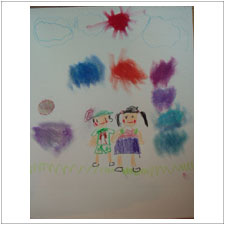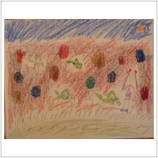 そのこちゃんのは秋の庭です。枯れ草の中に,ほらバッタがいっぱいいます。この後,バッタを捕まえて遊びましたね。 |