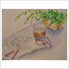 | しまぞえさんは,ゆったりとした読書の風景を描きました。シックなホテルの部屋に飾られているような,こころが休まる絵です。 |