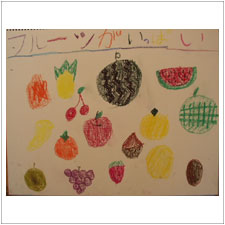 もうひとつは,おいしそうなフルーツがいっぱいです。めいちゃんは果物屋さんが好きなのかな? |