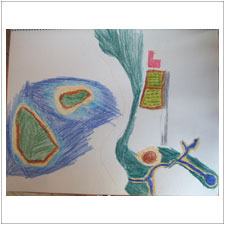 けんちゃんの絵は,航空写真のような地図。007とかスターウォーズなんかに出てきそうな,未来感のある絵です。 |