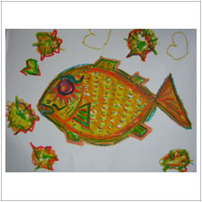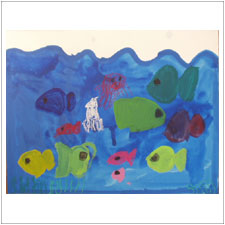 | めいちゃんは,みねちゃんが釣って帰ってきたお魚を見て,海の中にいるお魚をいっぱい描きました。気持ちよさそうですね。 |