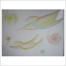 てつろうお父さんは,淡い色の鳥の絵を描きました。平和な感じ,やさしい感じ,ふっくらとした気持ち。おくりものって,そういう感じです。 |