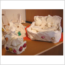 今年は粘土でサンタと橇をつくったり,大きな鉢植えのもみの木に飾りをいっぱい付けました。とてもきれいでしたよ。 |