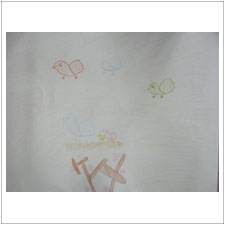 | そのこちゃん,うきうきぴょんぴょん弾んでいる鳥の絵を描きました。楽しい音楽が聞こえてきそうです。 |