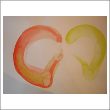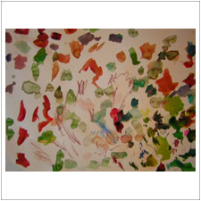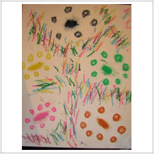 ご近所のみはるちゃんとりょうこお母さんが見学に来てくれました。みはるちゃんは2歳でこの感覚。春のお庭ような素敵な絵ができました。