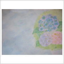 久しぶりに来てくれたかおるさんは,紫陽花を水彩で描いてくれました。花の繊細な感じや雨に濡れたたおやかな感じが表現されていて,しっとりとした気分になります。