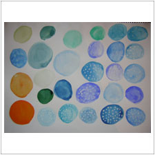 めいちゃんは雨の色をした水玉を描きました。はしっこにあるオレンジの水玉は,めいちゃんの好きな色。太陽のように早く出て来てほしいですね。