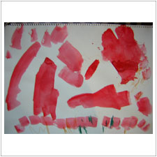 みはるちゃん,今日は赤の絵の具を自分で選びました。テーマがぐるぐるです。エネルギーがいっぱい,みなぎっているようです。