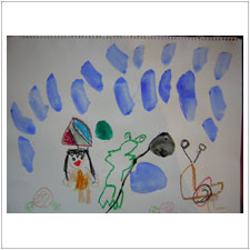 2枚目は雨の日に傘をさしているママの絵を描きました。かえるさんやかたつむりさんもいて,雨の日がとっても楽しそうですね。