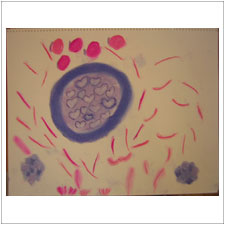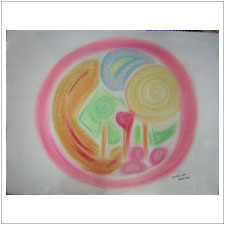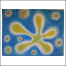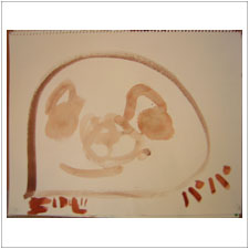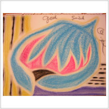 ぎんじ君がちょっと前に描いた絵です。不思議なモティーフなのですが,何とも色とフォルムのバランスが,美しく完成されているのに感心しきり。ママも喜んでいましたね。