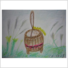 もう1枚はいつこさんが描いていた,お汐井取りのかご。そのこちゃんが描くとこんなにファンタジーになります。夢がいっぱい入っているのかな?
