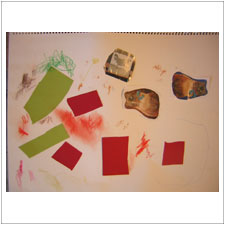 りょうこさんが気分を変えて,コラージュを勧めてみました。みはるちゃんは赤の画用紙,りょうこさんはネコちゃん。あらあら不思議なかわいい作品になりましたね。