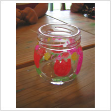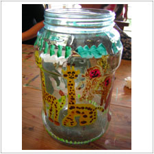 | しょうくんは夏休みの工芸作品に,ガラスの大きな瓶に大好きな動物の絵を描きました。ぐるっと違う動物が描かれています。大作ですね。 |