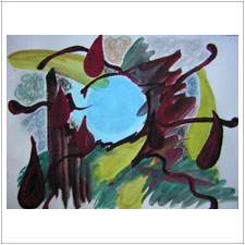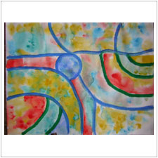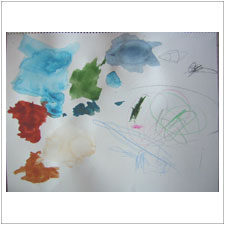 おにちゃんは丸に向かって猛然と突き進むイメージと,丸を支えるイメージが一度に出て来ました。急激な勢いに少し怯えたりもしましたが,支えられていることでほっとできたり。絵を描いて行く間にもたくさん気持ちが動きました。 |