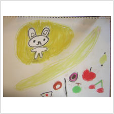 ひびきちゃん,丸と聞いたら,お月さまが出て来ましたよ。そしてちゃんとうさぎさんもいます。いっしょに好きな食べものを描きました。幸せでにっこりしてしまいます。 |