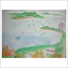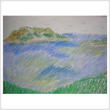 こちらはいつこさんが描いた風景。海と能古の島が見える風景にしきりに感動してくださいました。学校の先生のいつこさんは,いつも元気な若々しさが絵に表れています。 |