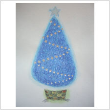 もう1枚,ブルーのツリー。静かで,ささやかで,温かくて。まるでくみこさんの存在そのもののような絵。もっともっと,思いどおりのイメージに近づきたいのだそうです。