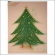 今日初めて見学に来てくださったみちこさんです。いろいろ画材の感じを試してみられて,これは練習なんだそうですけれど,すごく温かいツリーができました。