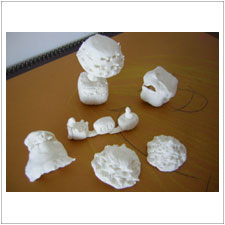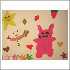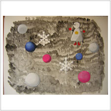 めいちゃんは雪だるま,うさぎさん,星,かわいい飾りものがいっぱいできました。この星は粘土に色を塗ってぺたぺたスタンプしたもの。星にも色が混ざって素敵ですね。
