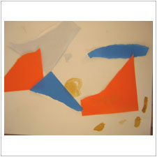 みはるちゃんとりょうこさんの素敵な共同コラージュです。さらっと色紙を破って貼られたのですが,きちんと構成されて,オレンジちゃんととブルーさんがお話しているように感じます,不思議ですね。