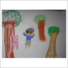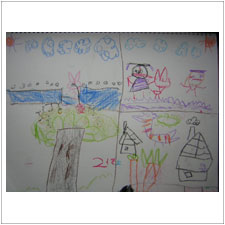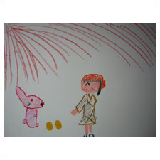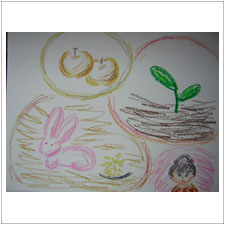 めいちゃんはうさぎがいじめられているところを描きました。このお話ではうさぎがとてもひどい目にあうので,悲しかったですね。