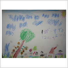 今日特別に参加してくれたりょうたくん&ゆきさんです。りょうたくんの絵はいろんなお話のシーンが細やかに出て来て,理解力と表現力に感激です。ゆきさんの作品,お写真撮り忘れました,お見せできなくて残念です。