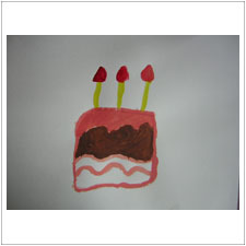 | この日はひかるちゃんとあかねさんがケーキを焼いて持って来てくださいました。とてもおいしくて感動。ひかるちゃんの絵は,おいしいケーキ。おごちそうさま。 |