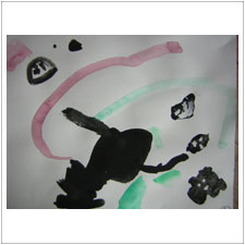 | みはるちゃんの絵は,黒いおばけ。このモティーフはみはるちゃんの中にいる何もの?かの象徴。ちょこちょこと顔を出して,憎めないやつです。 |